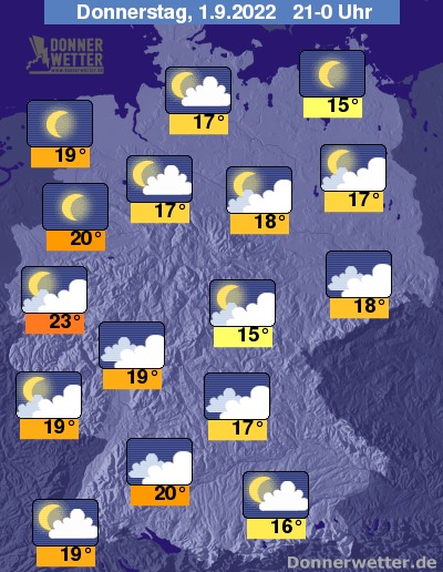 Die Temperaturen gehen bis Mitternacht auf Werte um 23 Grad in der Kölner Bucht und 15 Grad in Erfurt zurück.