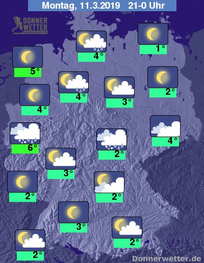 In den Abendstunden lockern die Wolken zunächst im äußersten Nordwesten sowie in der Südwesthälfte gebietsweise auf. Im weiteren Verlauf zeigen sich Wolkenlücken dann auch in in vielen anderen Landesteilen, im Küstenumfeld sowie im Südwesten kann es auch aufklaren. Immer wieder muss in den kommenden Stunden mit Niederschlägen gerechnet werden, die in der Nordhälfte meist als Regen, im Süden auch als Schneeregen oder Schnee fallen. Am späten Abend sind dann nur regional Schauer zu erwarten.