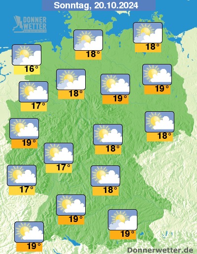 Am Sonntag ist es vor allem im Osten verbreitet heiter. Im übrigen Bundesgebiet kann sich auch zeitweise die Sonne zeigen, teilweise hält sich aber auch noch stärkere Bewölkung, es bleibt jedoch landesweit trocken. Die Temperatur erreicht 16 Grad an der Nordsee und bis 19 Grad am Alpenrand.