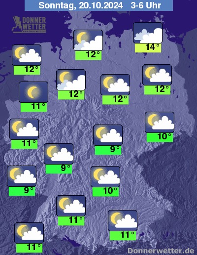 In der Nacht zum Sonntag lockert die anfangs noch oft starke Bewölkung mehr und mehr auf. Gegen Morgen ist es dann in weiten Landesteilen nur noch gering bis wechselnd bewölkt, dazu bleibt es trocken. Die Temperatur sinkt auf 14 Grad auf Rügen und bis 9 Grad am Pfälzer Wald.