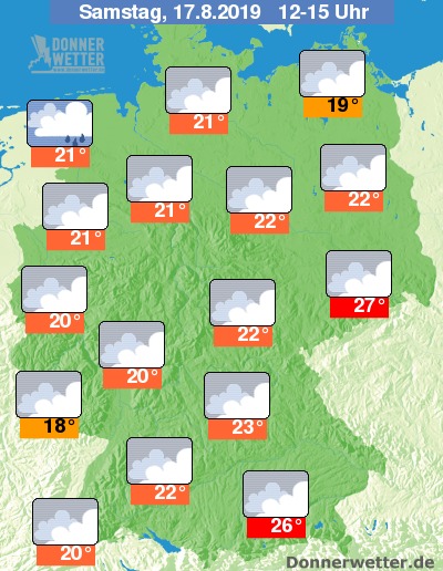 Heute Nachmittag zeigt sich der Himmel über dem Land verbreitet dicht, nur hier und da auch mal etwas aufgelockert bewölkt. Im Nordwesten ist dazu gebietsweise Regen möglich, sonst bleibt es weitgehend trocken. Die Temperatur steigt auf 18 Grad am Pfälzer Wald und bis 27 Grad in der Lausitz.