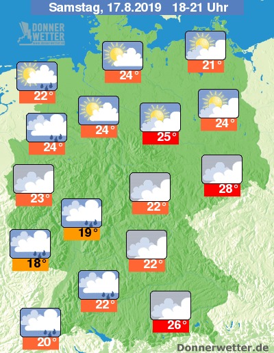 Heute Abend ist es über dem Norden und Osten teils aufgelockert, teils stark bewölkt un dazu weitgehend trocken. Im übrigen Bundesgebiet halten sich meist dichte Wolken, dazu fällt in den westlichen Landesteilen gebietsweise Regen, sonst bleibt es weitgehend trocken. Die Temperatur liegt anfangs noch bei 18 Grad im Saargau und bis zu 28 Grad in Dresden.