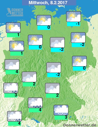 Heute bleibt es über der Südhälfte der Bundesrepublik bedeckt, dazu fällt im Süden und Südwesten auch zeitweise Regen, Schneeregen oder Schnee. Besonders im Nordwesten, aber auch im übrigen Norden zeigen sich Auflockerungen, dabei bleibt es trocken. Die Temperatur steigt auf -2 Grad in Erfurt und bis etwa 4 Grad entlang des Rheins.
