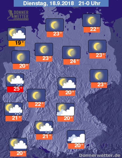 Die Temperaturen sinken in der Nacht zunächst auf Werte um 19 bis 15 Grad C.