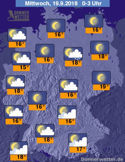 In der Nacht zeigt sich der Himmel über der Nordosthälfte zumeist sternenklar, in den übrigen Landesteilen überwiegt lockere oder aufgelockerte Bewölkung. Zwischen Mosel und Oberrhein sowie in der Altmark können in der Nacht regionale Schauer fallen, sonst bleibt es meist trocken.
