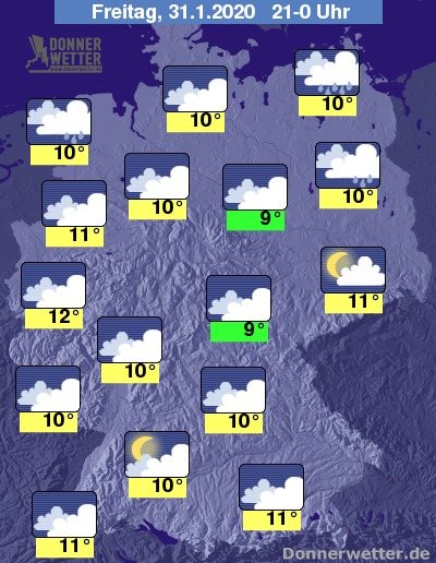 Am Abend regnet oder nieselt es in den küstennahen Gebieten, sowie über Schleswig-Holstein. Im übrigen Land bleibt es abgesehen von örtlichem Sprühregen niederschlagsfrei. Im Lee der Mittelgebirge kann die Wolkendecke auch mal aufreißen.