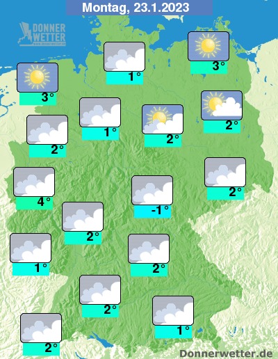 Heute ist es überwiegend stark bewölkt bis bedeckt, im Norden ist es vielerorts auch heiter bis sonnig. Im Süden fällt gelegentlich etwas Schnee, während es im übrigen Bundesgebiet weitgehend trocken bleibt. Die Temperatur steigt auf -1 Grad in Erfurt und bis 4 Grad in der Kölner Bucht.