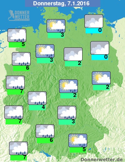 Am Donnerstag ist es anfangs bei überwiegend starker und gebietsweise aufgelockerter Bewölkung noch meist trocken, nur hier und da fällt etwas Regen, Schneeregen oder Schnee, dabei kann es glatt auf den Straßen sein! Ab den Mittagsstunden zieht im Westen und Südwesten teils kräftiger Regen, anfangs auch teils Schneeregen auf, der sich bis zum Abend auf die gesamte Südwesthälfte der Republik erstreckt. Im Norden und Osten bleibt es meist wolkenverhangen, jdeoch auch bis zum Abend noch weitgehend trocken. Die Temperatur steigt auf 0 Grad im Nordosten und bis 7 Grad in den westlichsten Landesteilen. Im Norden und Westen weht teils starker, an der Nordsee stürmischer Wind.