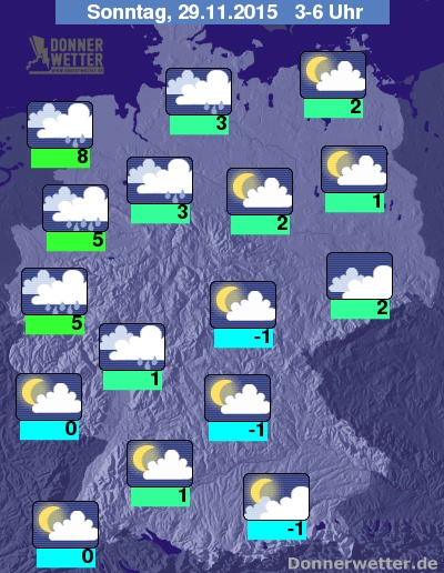 In der Nacht zum Sonntag bleibt es im Süden und auch im Osten meist locker oder aufgelockert bewölkt, teils aber auch stark bewölkt, dabei jedoch trocken. Sonst ziehen von Nordwesten allerdings dichte Wolken mit zeitweiligem Regen und teils auch Schneeregen durch. Die Temperatur sinkt auf 8 Grad in Ostfriesland und bis -1 Grad im Süden Bayerns. Es weht verbreitet frischer bis starker, im Westen und Norden auch stürmischer Wind, an den Küsten und auf den Bergen herrscht teils schwerer Sturm.