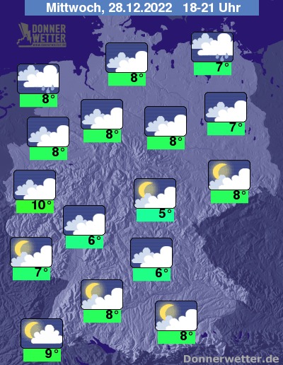 Heute Abend sind im Süden und Osten noch Auflockerungen möglich, sonst ist es jedoch verbreitet bedeckt und im Norden, Nordwesten und im Verlauf auch im Westen fällt gebietsweise Regen. Im übrigen Land bleibt es trocken bei 5 Grad in Erfurt und 10 Grad in Köln. Im Norden und Westen ist es zum Teil stürmisch, an der Nordsee herrscht Sturm.