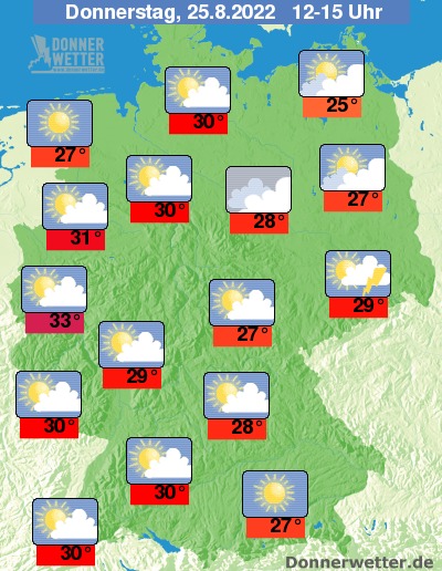 Heute Nachmittag ist es heiter oder sonnig, hier und da bilden sich auch ein paar Quellwolken. Im östlichen Sachsen sind lokale Schauer und Gewitter möglich, sonst bleibt es trocken. Die Temperatur liegt bei 25 Grad in Rostock und bis 33 Grad in Köln.