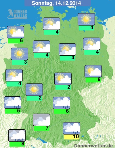 Am Sonntag halten sich besonders im Süden, aber teils auch im Osten weitgehend dichte Wolken und es fällt teils langanhaltender Regen, im Norden und Westen ist es häufig stark bewölkt, jedoch kann die Bewölkung hier gebietsweise auch auflockern und der Sonne Platz machen, dazu bleibt es auch trocken. Die Temperatur steigt auf 2 Grad im Westerwald und bis 10 Grad in München.