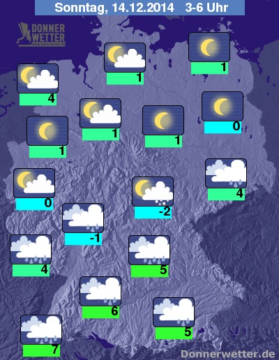 In der kommenden Nacht bleibt es in der Südhälfte der Republik weitgehend bedeckt und es fällt zeitweise Regen, nach Norden hin auch Schneeregen oder Schnee. In der Nordhälfte des Landes lockert die Bewölkung dagegen meist auf und häufig ist der Himmel sogar sternenklar, dabei bleibt es trocken, jedoch bildet sich stellenweise Nebel oder Hochnebel. Die Temperatur sinkt auf 7 Grad in Freiburg und bis -2 Grad am Thüringer Wald.