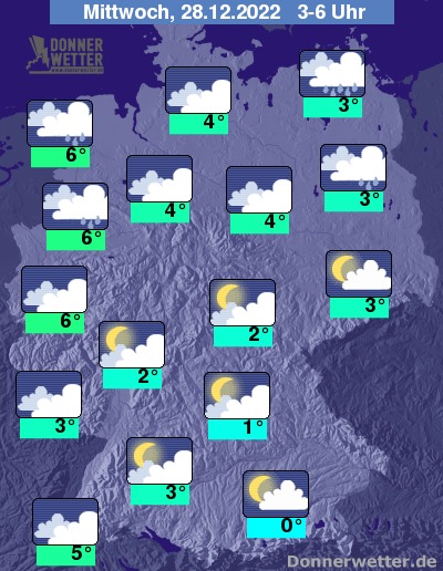 In der folgenden Nacht zieht im Nordwesten und Norden Regen herein. Im übrigen Land ist es zwar ebenfalls meist dicht bewölkt, jedoch bleibt es weitgehend trocken. Vor allem im Südosten sind auch vielerorts Auflockerungen möglich. Die Temperatur sinkt auf 6 Grad an der Ems und bis 0 Grad im Berchtesgadener Land. Im Norden und Westen weht ein oft stürmischer Wind. An der Nordsee herrscht Sturm.