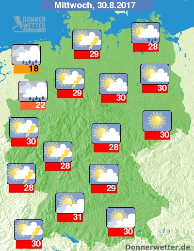 Am Mittwoch bleibt es im Osten Deutschlands noch meist heiter und dazu trocken, sonst ziehen von Westen und Nordwesten her zunehmend dichterwerdene Wolken auf, die nachfolgend auch teils kräftigen und gewittrigen Regen bringen. Über der Osthälfte bleibt es bis zum Abend noch weitgehend trocken. Die Temperatur steigt auf 18 Grad in Emden und bis 31 Grad im Raum Stuttgart.