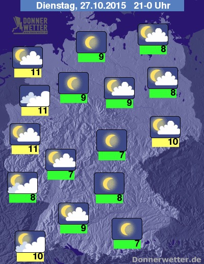 In der Nacht zum Mitwoch bleibt der Himmel meist locker oder aufgelockert bewölkt, vor allem in der Mitte und im Osten des Landes zeigt sich gebietsweise ein sternenklarer Nachthimmel. Im Südwesten werden die Wolken zunehmend dichter und gegen Morgen ist hier und da auch etwas Regen möglich, sonst bleibt es jedoch trocken. Die Tiefstwerte liegen bei 10 Grad in Freiburg und bis 3 Grad im Eichsfeld.