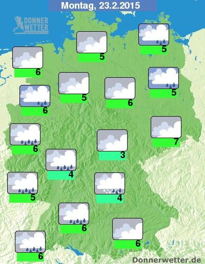 Der Start in die neue Wetterwoche fällt alles andere als schön aus, denn es ziehen landesweit weitgehend dichte Wolken übers Land. Dazu fällt immer wieder, zum Teil langanhaltender Regen, gebietsweise ist auch Schneeregen möglich. Die Temperatur steigt auf 3 bis 7 Grad.