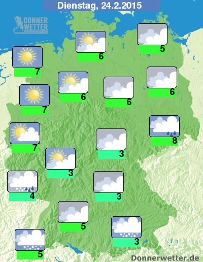 Am Dienstag ist es vor allem nach Nordwesten deutlich freundlicher als am Vortag, sonst halten sich jedoch weiterhin meist dichte Wolken, wobei sich die Niederschläge in Form von Schnee, Schneeregen und Regen meist auf den Süden und teils auf den Osten beschränken. Es werden kühle 3 bis 8 Grad erreicht.