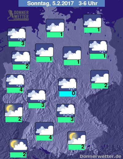 In der Nacht zum Sonntag zieht ein Niederschlagsband von der Südwesthälfte der Republik weiter in den Norden und Osten, es schwächt sich dabei jedoch ab, so dass über dem Norden und Osten dann nur noch gebietsweise Regen fällt. Von Südwesten her klingen die Niederschläge im Verlauf ab und es lockert nach und nach auf. Die Temperatur sinkt auf 4 Grad in der Kölner Bucht und bis 0 Grad im Vogtland.