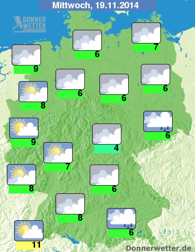 Der Mittwoch wird voraussichtlich nur geringfügig besser, denn es halten sich weiterhin meist viele Wolken, wobei die Wolkendecke häufig verschlossen bleibt. Jedoch zieht sich der Regen im Süden und Osten des Landes im weiteren Tagesverlauf immer mehr auf den Südosten Deutschlands zurück, hier klingen die Niederschläge erst im Laufe des Abends ab. In den anderen Landesteilen bleibt es weitgehend trocken. Die besten Chancen auf Sonne gibt es hingegen im Südwesten, aber auch im Westen und Nordwesten der Republik kann die Bewölkung hier und da etwas auflockern. Die Temperatur steigt auf 4 Grad im Vogtland und bis zu 11 Grad in Freiburg.