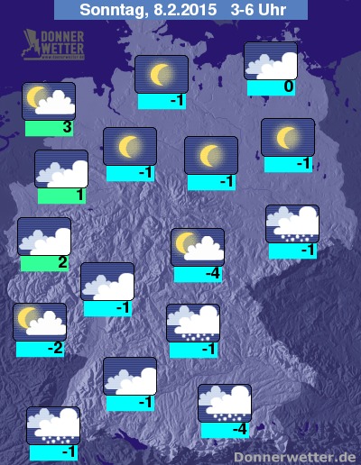 In der folgenden Nacht fällt vor allem im Süden und Osten, aber auch in der Mitte des Landes zeitweise Schnee, nach Westen hin ist es meist stark bewölkt, aber überwiegend trocken, nach Norden reißt der Himmel meist auf und oft wird es sternenklar, gebietsweise ziehen aber auch dichterer Wolken durch, dazu bleibt es trocken. Die Temperatur sinkt auf 3 Grad in Ostfriesland und bis -4 Grad im Coburger Land.