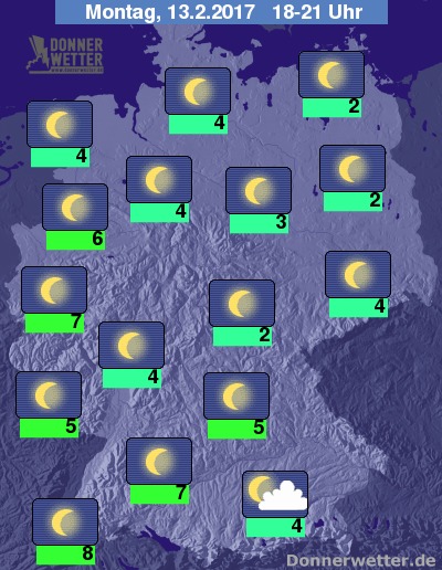 In der Nacht zum Dienstag ist es nur im Alpenvorland häufig neblig-trüb oder auch stark bewölkt, sonst zeigt sich ein sternenklarer Nachthimmel. Es bleibt überall trocken bei Tiefstwerten von 2 Grad im Oberrheingraben und um -5 Grad in der Uckermark.