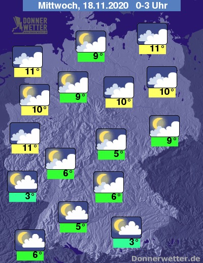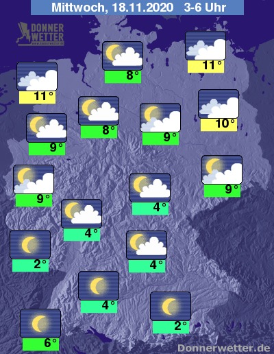 Während der zweiten Nachthälfte ist es über dem Norden wechselnd, regional aber auch stärker bewölkt. In der Mitte und im Süden klart es teilweise für längere Zeit auf, bevor sich jedoch im weiteren Verlauf gebietsweise Nebelfelder bilden können.