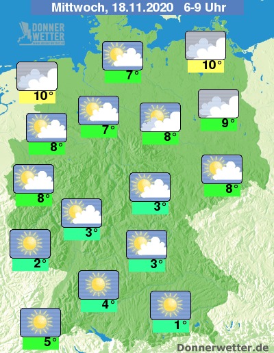 Bis zu den Frühstunden kühlt die Luft im Norden auf 11 bis 8 Grad, im Süden auf 6 bis 2 Grad ab, stellenweise kann es hier leichten Bodenfrost geben.