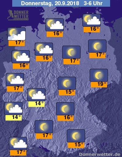 In späten Abend und in der Nacht zeigt sich der Himmel in der Nordwesthälfte sowie entlang der Oder, später dann auch entlang des Rheins, locker bewölkt. Im Süden sowie in der Mittel bleibt es meist sternenklar. Einzelne Schauer können regional in Sachsen fallen, sonst bleibt es zumeist trocken.