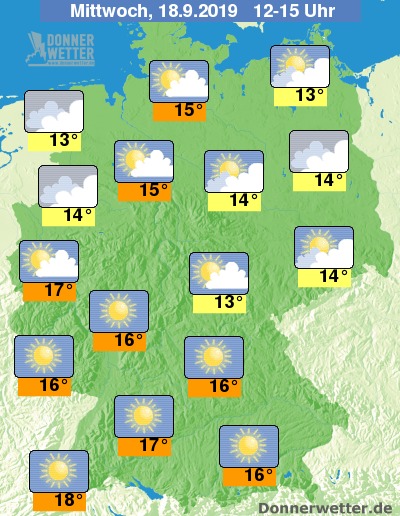 Die Temperaturen bewegen sich zwischen 12 und 15 Grad im Norden und Osten, im Süden und Westen werden etwas wärmere 15 bis 18 Grad erreicht.