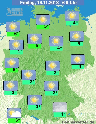 Der Freitag startet vielerorts sonnig und freundlich, im äußersten Süden ist es teils auch nebelig oder locker bewölkt.