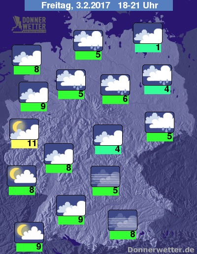 In der Nacht zum Samstag zieht sich der Regen in den äußeren Norden, Nordosten und Osten des Landes zurück. Gebietsweise regnerisch bei dichten Wolken ist es auch im Alpenvorland sowie am Niederrhein. In den übrigen Landesteilen ist es mehrheitlich stark, hier und da aber auch nur locker bewölkt und weitgehend trocken. Die Temperatur sinkt auf 5 Grad im nördlichen Emsland und bis 0 Grad im Thüringer Becken.
