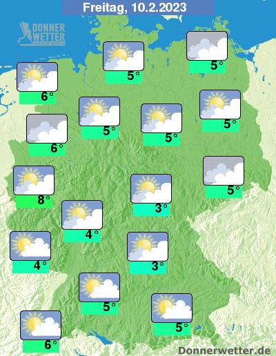 Am Freitag zeigt sich der Himmel südlich der Donau noch häufig heiter oder es ist sonnig; in den restlichen Landesteilen ist es teils wechselnd, teils stark bewölkt. Bis auf etwas Regen oder Sprühregen in Küstennähe bleibt es trocken.