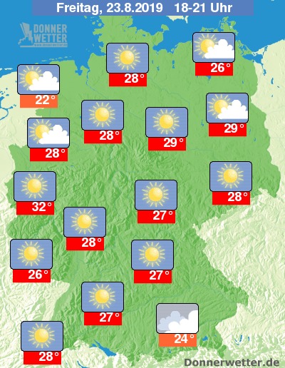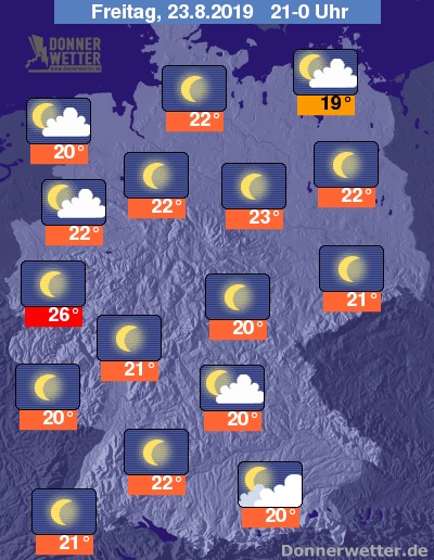 Die Temperaturen liegen am Abend bei Werten um 22 bis 32 Grad und sinken im weiteren Verlauf auf Werte um 19 bis 26 Grad.