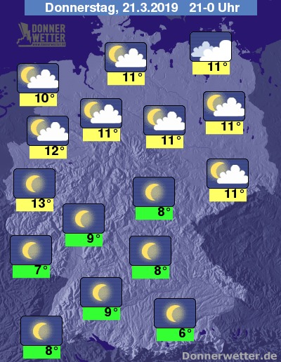 Bis zu den Frühstunden kühlt die Luft auf 0 bis 7 Grad ab. In der Nordhälfte bleibt es dabei allgemein am mildesten, am Alpenrand am kältesten. Häufig muss noch mit Bodenfrost gerechnet werden.
