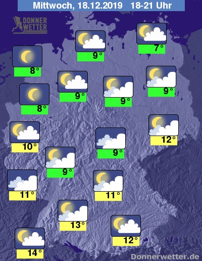 Vor Beginn der Dämmerung liegen die Temperaturen noch zwischen 7 Grad ganz im Nordosten und 14 Grad ganz im Südwesten.