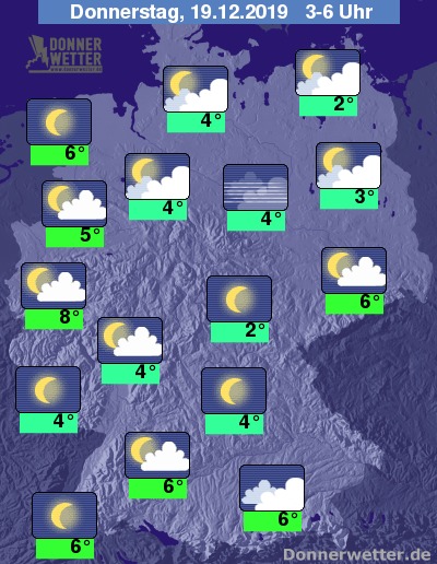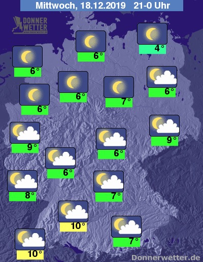 Während der zweiten Nachthälfte erreichen lockere Wolkenfelder auch den Norden. Sonst kann man zeitweise Mond und Sterne beobachten. Lediglich in Teilen Südbayerns können die Wolken auch mal etwas dichter werden. Über Sachsen-Anhalt kann sich stellenweise Nebel bilden.