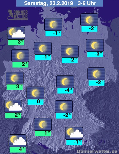 Bis zu den Frühstunden kühlt die Luft auf frostige -5 bis 0 Grad ab. Etwas milder mit 1 bis 4 Grad bleibt es im Südwesten und Westen.
