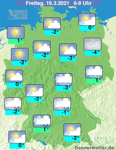 In der Nacht auf Freitag zeigt sich der Himmel über der Nordhälfte des Landes zunächst noch wechselnd oder stark bewölkt, in den frühen Morgenstunden lockert es hier dann zunehmend auf; im Nordwesten funkeln die Sterne auch von einem wolkenlosen Himmel. In der Südhälfte des Landes bleibt es meist wolkenverhangen und vor allem in den südöstlichen Landesteilen fällt gebietsweise Schneeregen oder Schnee.