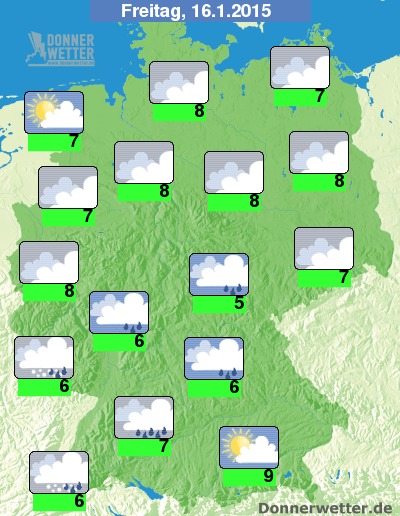 Am Freitag halten sich mehrheitlich starke oder dichte Wolken, dabei fällt vor allem in einem breiten Streifen vom Südwesten bis in den Osten Deutschlands zeitweise Regen, sonst bleibt es weitgehend trocken. Die größten Chancen für Auflockerungen gibt es im Küstenumfeld und auch im Südosten des Landes, aber auch sonst kann sich hier und da mal die Sonne blicken lassen. Die Temperatur steigt auf 5 Grad im Coburger Land und bis 9 Grad am Starnberger See. Im Norden weht zunächst noch frischer bis starker und in Böen stürmischer Wind. An der See weht der Wind anfangs noch teils stürmisch mit möglichen Sturmböen. Bis zum Abend lässt der Wind deutlich nach.