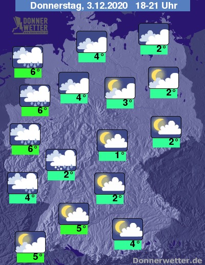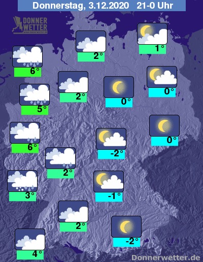Am Abend muss im Westen mit Niederschlägen gerechnet werden, die in höheren Lagen der Westdeutschen Mittelgebirge als Schnee oder Schneeregen fallen. Streckenweise muss mit Straßenglätte gerechnet werden. Auch im Rhein-Main-Gebiet fällt gelegentlich leichter Schneeregen. In den anderen Gebieten bleibt es trocken und teilweise lassen die Wolken den Blick zu Mond und Sternen frei.