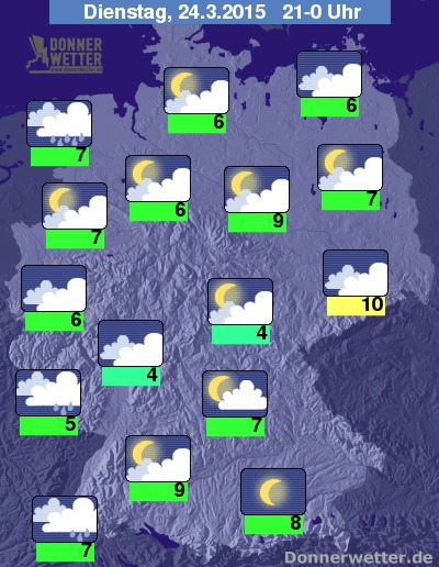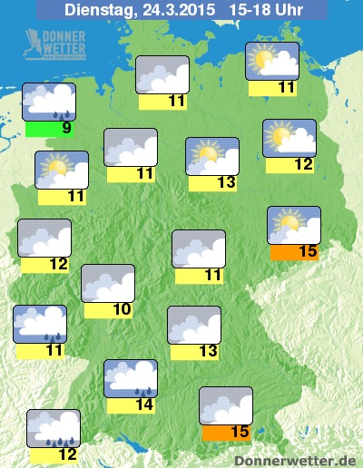 Heute Nachmittag ist es im Osten und Nordosten des Landes noch meist aufgelockert bewölkt, sonst ziehen zunehmend dichte Wolken auf und in den westlichsten Landesteilen sowie im Südwesten Deutschlands kann gebietsweise Regen fallen, sonst bleibt es hingegen weitgehend trocken. Die Temperatur liegt bei 9 Grad an der Nordseeküste und rund 15 Grad in Dresden und München.