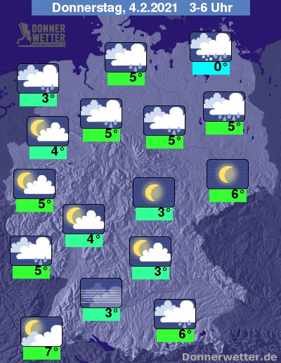 In der Nacht kommenden Nacht ist es über der Südhälfte Deutschlands meist locker bewölkt oder sternenklar, an den Alpen und über der Pfalz bringen dichte Wolken jedoch auch gebietsweise Regen. Im Norden und Nordosten bleibt es bedeckt und es fällt verbreitet Regen. Im Ostseeumfeld fällt größtenteils Schnee. Die Temperatur sinkt auf 7 Grad im Breisgau und etwa 0 Grad an der Ostsee.