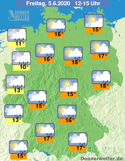 Bis zum frühen Abend ändert sich an der Wetter- und Temperaturverteilung recht wenig. Im weiteren Verlauf erreichen die Regengüsse auch wieder die nordöstlichen Landesteile.