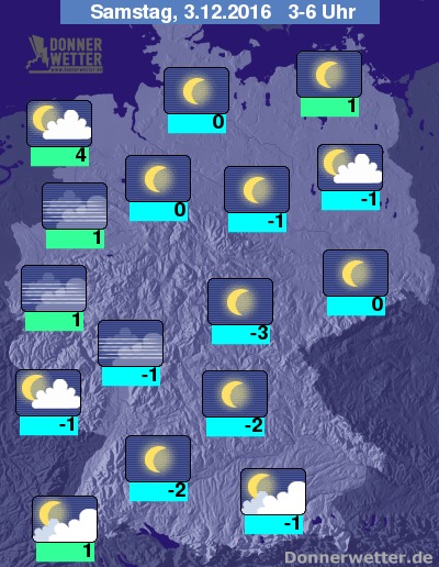 In der Nacht zum Samstag halten sich im Süden zunächst noch oft dichte Wolken aus denen hier und da etwas Regen oder Schnee fällt, dazu sind glatte Straßen möglich! Im großen Rest der Bundesrepublik zeigt sich jedoch ein verbreitet sternenklarer Nachthimmel, dabei bleibt es trocken. Stellenweise kann sich Nebel oder Hochnebel bilden. Die Temperatur sinkt auf 4 Grad in Emden und bis auf -3 Grad im Vogtland.