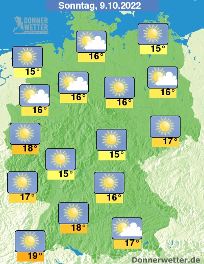 Am Sonntag strahlt die Sonne von einem meist wolkenlosen Himmel, hier und da können ein paar Wolken durchziehen. dabei bleibt es trocken. Die Temperatur steigt auf 15 Grad im Vogtland und bis etwa 19 Grad am Oberrhein.