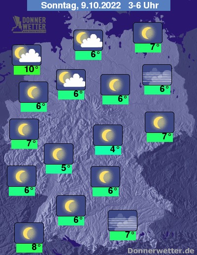 In der Nacht zum Sonntag zeigt sich der Himmel über der Bundesrepublik verbreitet sternenklar. An den Alpen bildet sich hier und da Nebel. Im Nordwesten können lockere Wolkenfelder durchziehen. Bei Tiefstwerten von 10 Grad in Bremerhaven und 4 Grad in Jena bleibt es landesweit trocken.