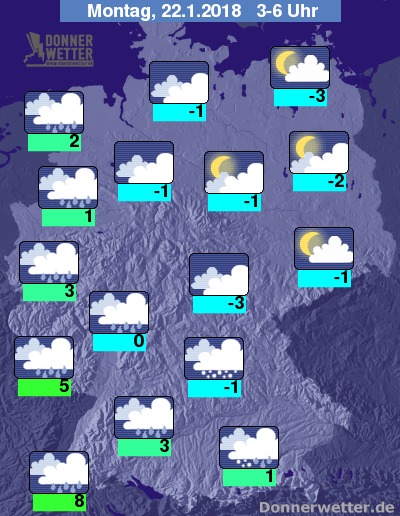 In der folgenden Nacht dehnt sich das Niederschlagsgebiet mit Regen, anfangs auch Schneeregen und Schnee, nordostwärts aus und überdeckt zum Morgen hin die komplette Südwesthälfte des Landes. Weiter nach Nordosten ist es zunächst oft aufgelockert, zum Morgen hin jedoch größtenteils stark bewölkt, jedoch noch trocken. Die Temperatur sinkt auf 8 Grad in Freiburg und bis -3 Grad in Neubrandenburg.