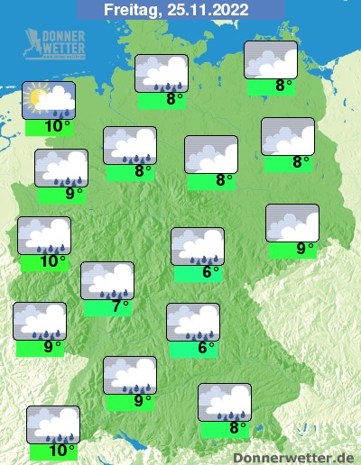 Am Freitag bleibt es überwiegend stark bewölkt oder trüb, Auflockerungen sind dazu nur vereinzelt möglich. Es fällt gebietsweise Regen, wobei es im Nordosten und Osten weitgehend trocken bleibt. Die Temperatur steigt auf 6 Grad in Mittelfranken und bis 10 Grad im Emsland.