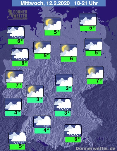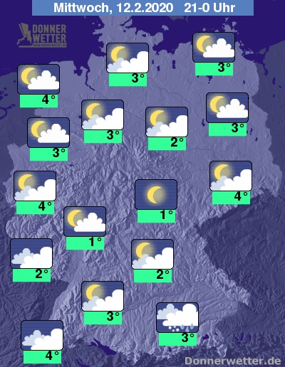 In den Abendstunden lockert die Wolkendecke zunächst im Norden und der Mitte Deutschlands häufig auf, südlich des Mains bleibt der Himmel anfangs noch stark bewölkt oder bedeckt. Mit einzelnen Regen-, Schneeregen- oder Schneeschauern muss am Abend vor allem noch im Nordwesten sowie in der Südhälfte gerechnet werden. Der Wind flaut am Abend von Südwesten her deutlich ab.